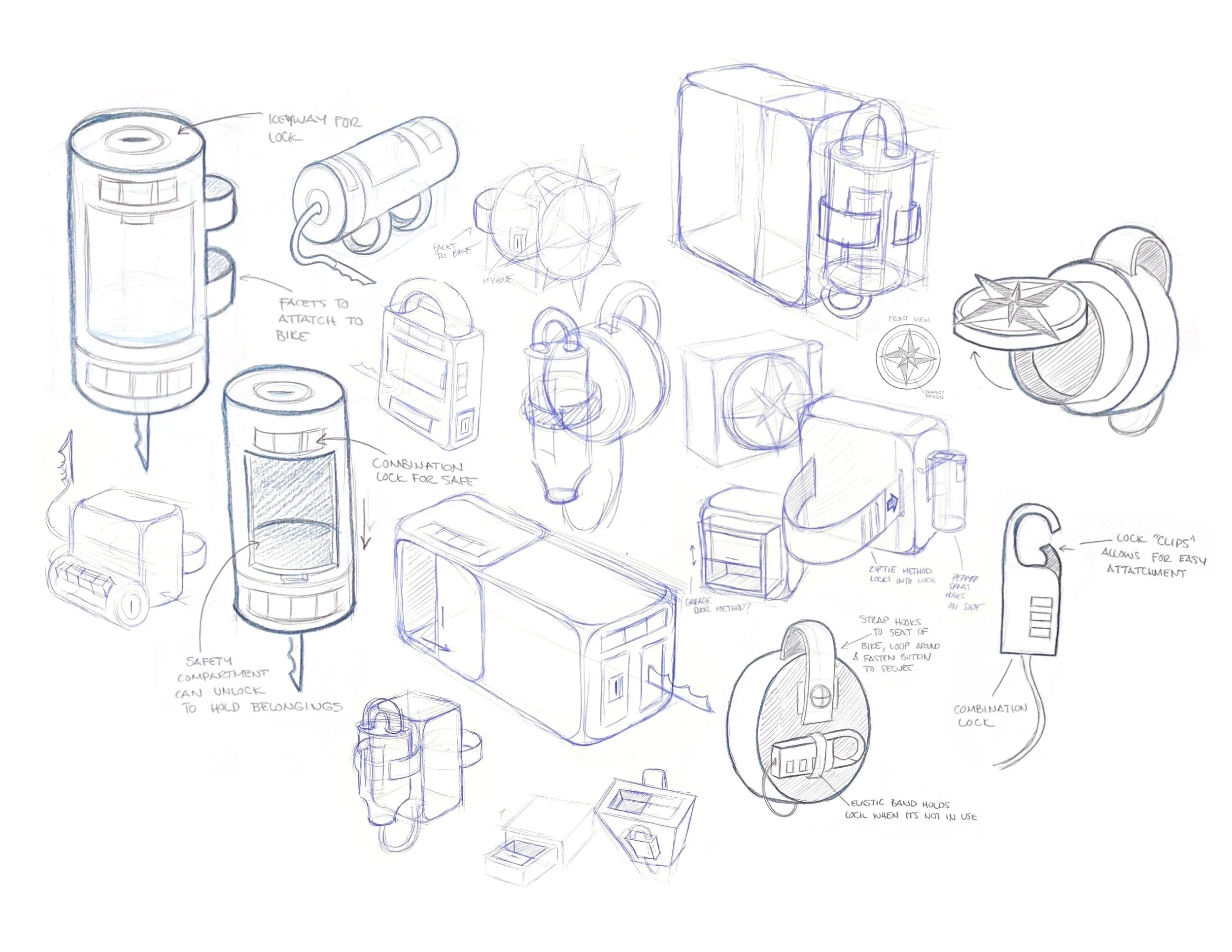 I began this project by doing a study on the current most popular types of bike locks. I looked at their individual design successes and design flaws, so that I could better understand what works well for the locks, and what opportunities there were to improve that my lock could do.