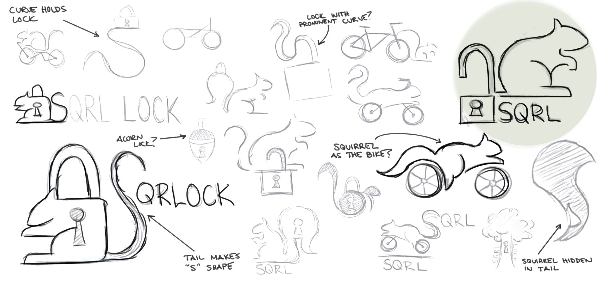 I wanted to design a logo that would help with the brand visualization of my lock. I began by sketching different thumbnails, trying to combine the squirrel and lock figures together.