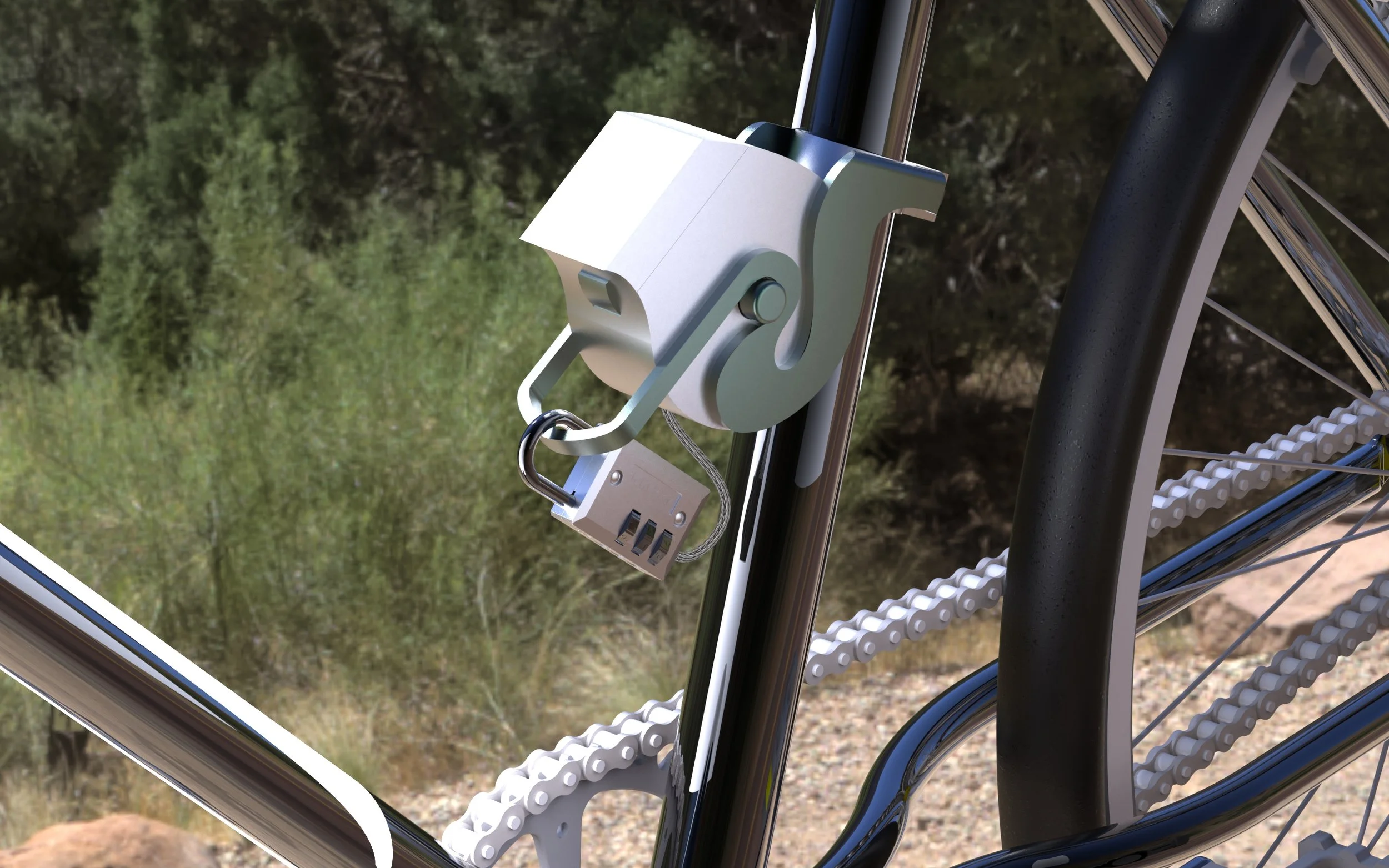 after settling on the final design of my lock, I began playing around with different placements of my low fidelity model on an actual bike frame. I focused on trying to find the most optimal placement for the lock that would likely fit other frames and still be in a secure area that the biker could reach if needed.