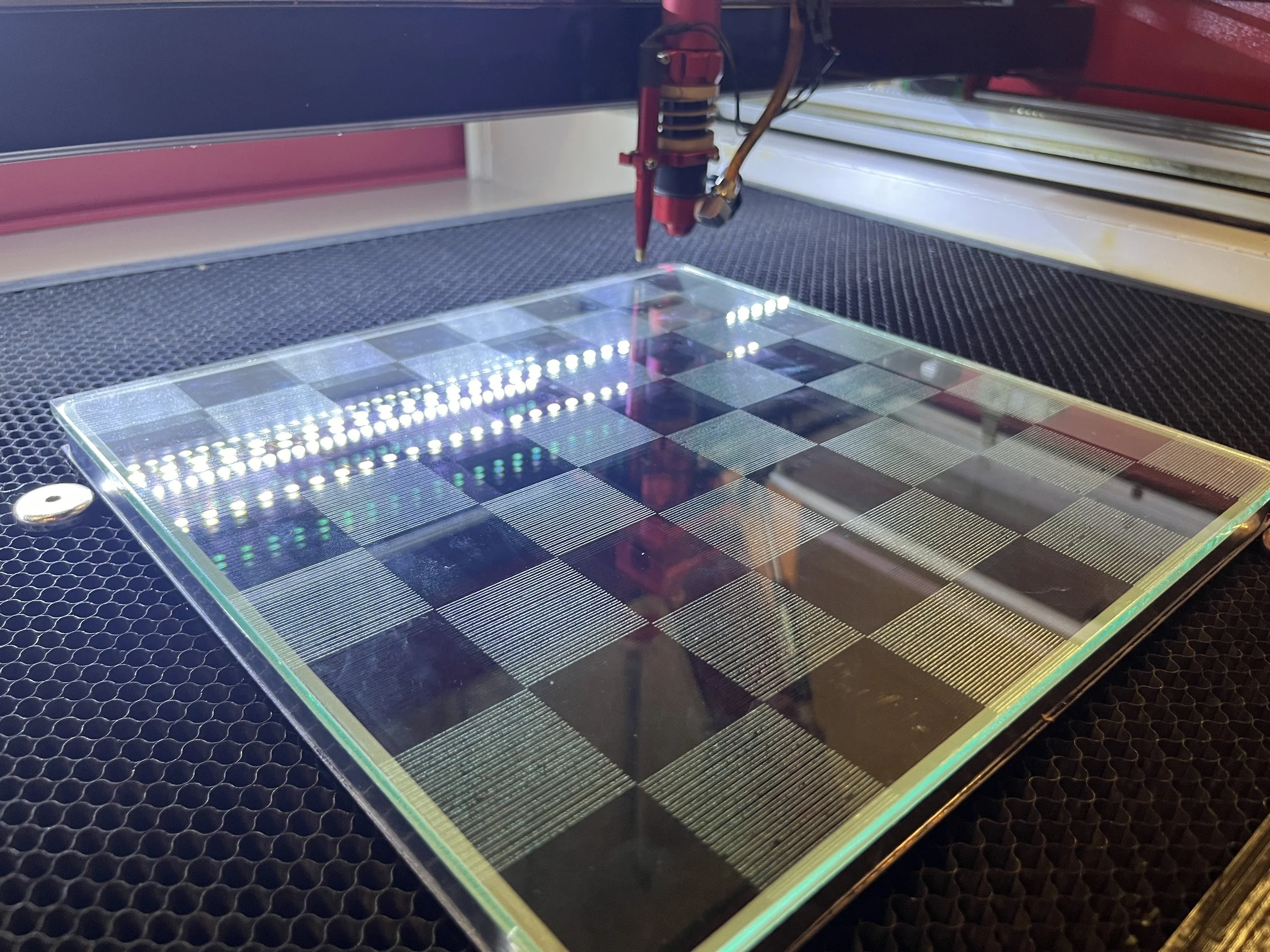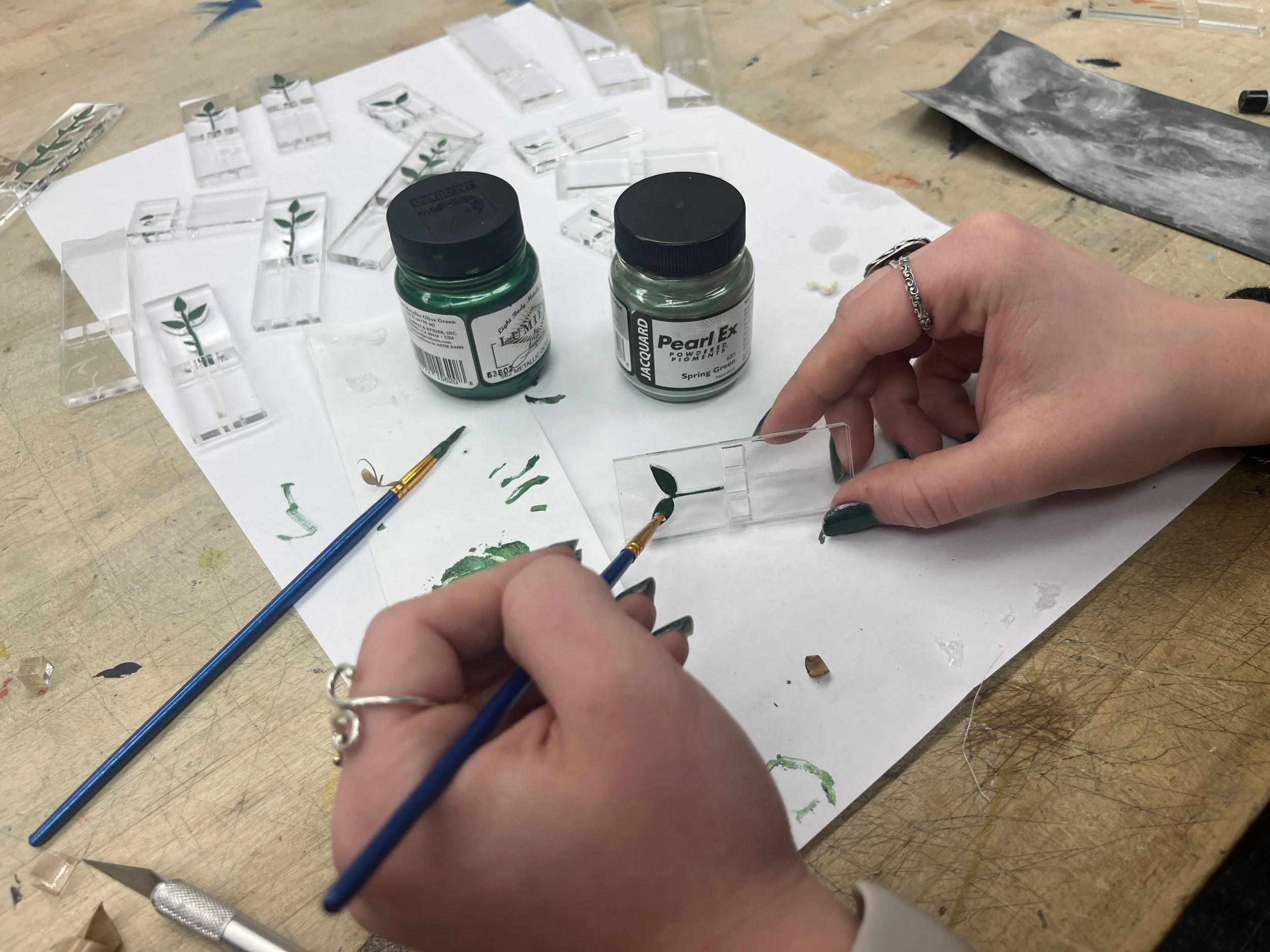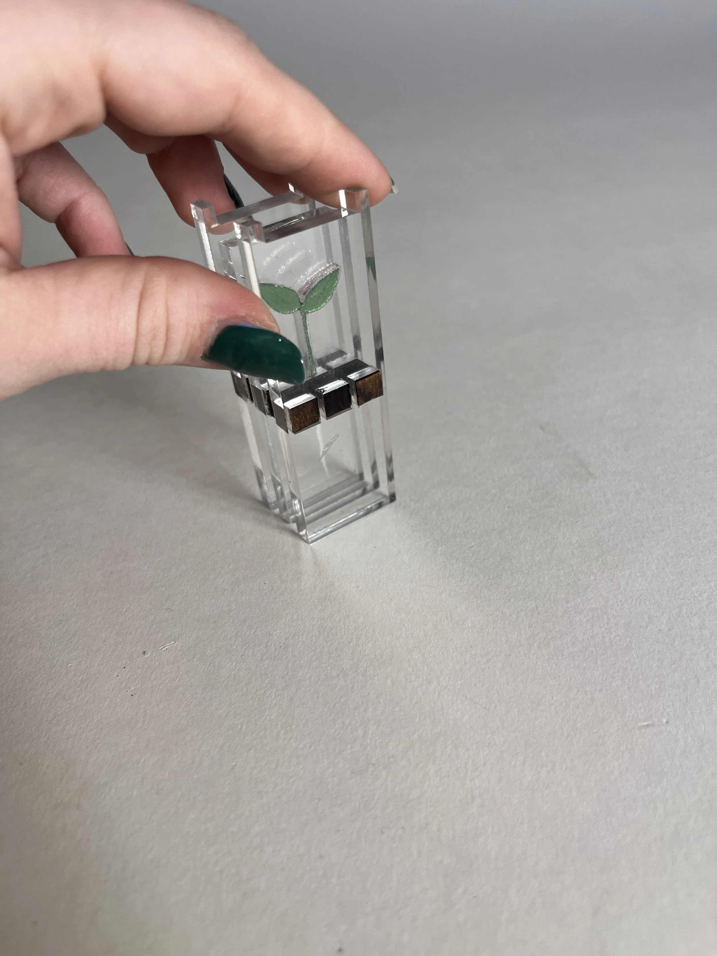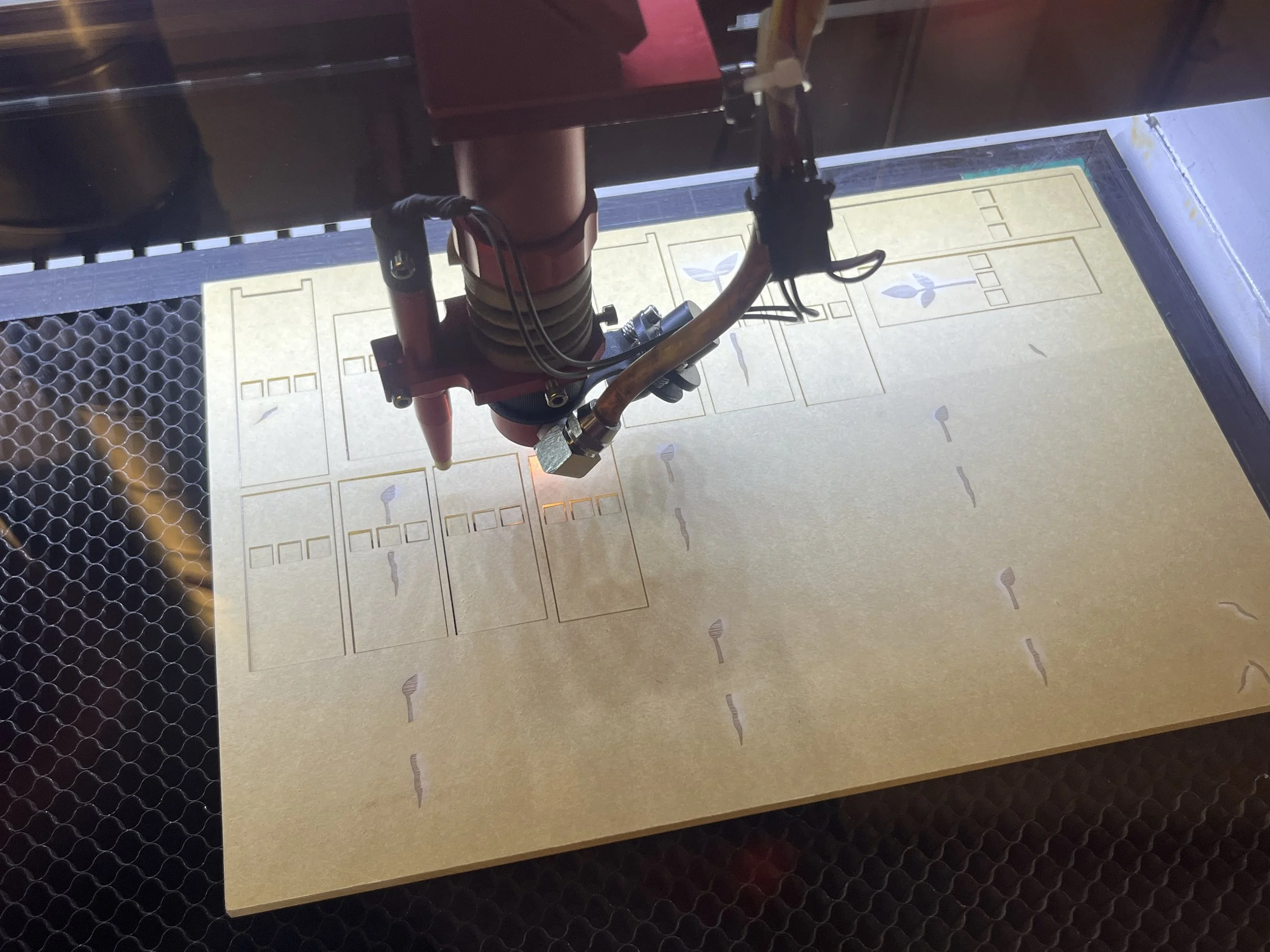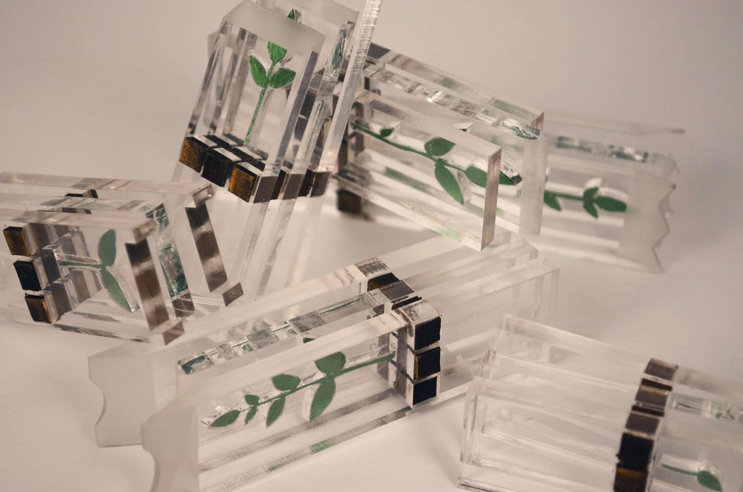 laser cutting the layered pieces out of 1/8” clear acrylic, the plant and root forms were laser engraved.
